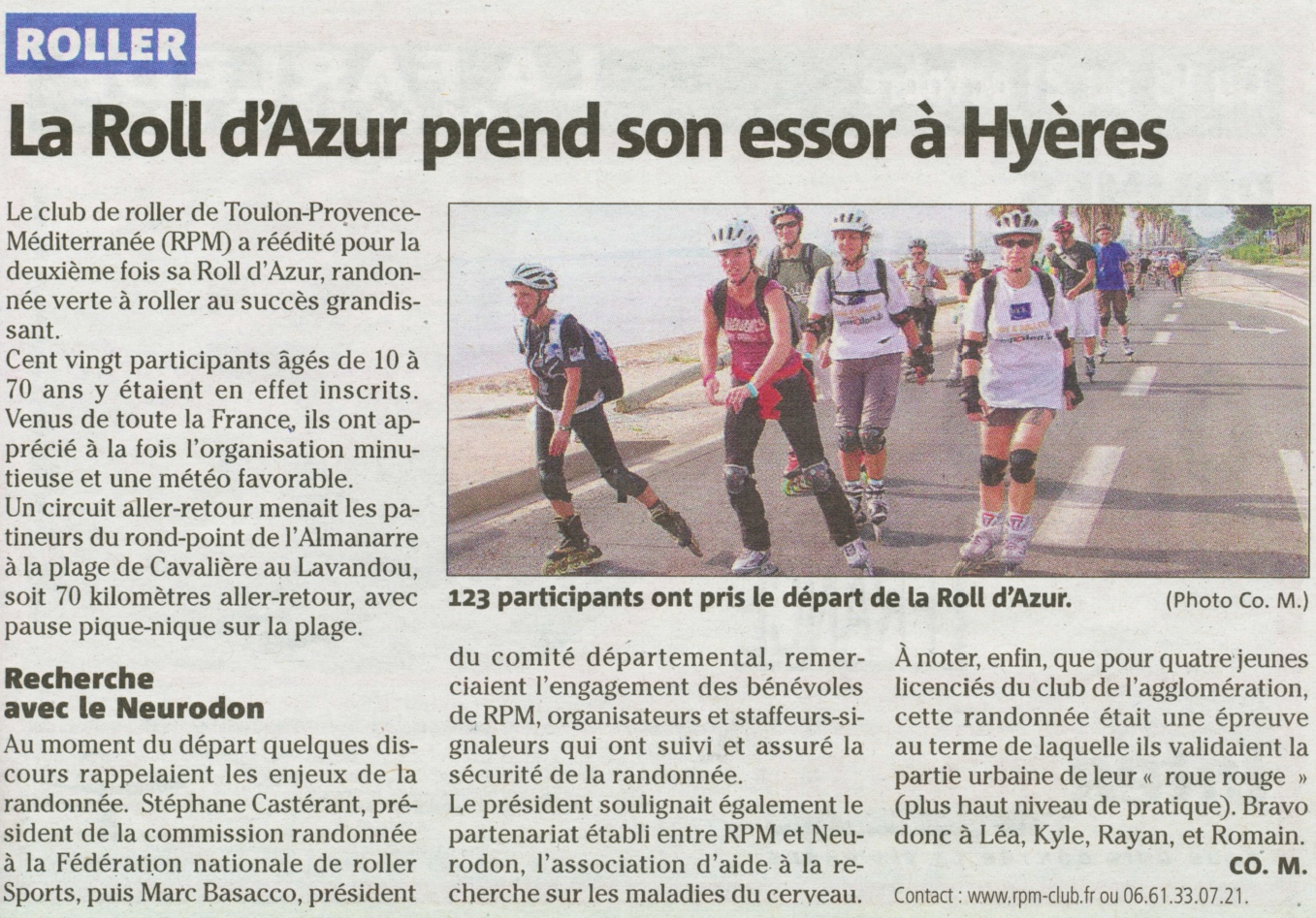 68 km, 122 participants venant de toutes les régions françaises, 22 staffeurs/signaleurs, le Président de la Commission Randonnée de notre Fédération Nationale Stéphane Casteran, le Président du Comité Départemental de Roller Sports Marc Basacco, Le Chargé de Mission de Neurodon Aurélien Léauté, les Polices Municipales d'Hyères et de La Londe Les Maures, 1 minibus, une voiture avec gyrophare... c'est ... c'est ... "La Roll d'Azur II"